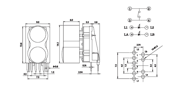 · 9 mm x 13.6 mm x 6.0 mm LED the switch