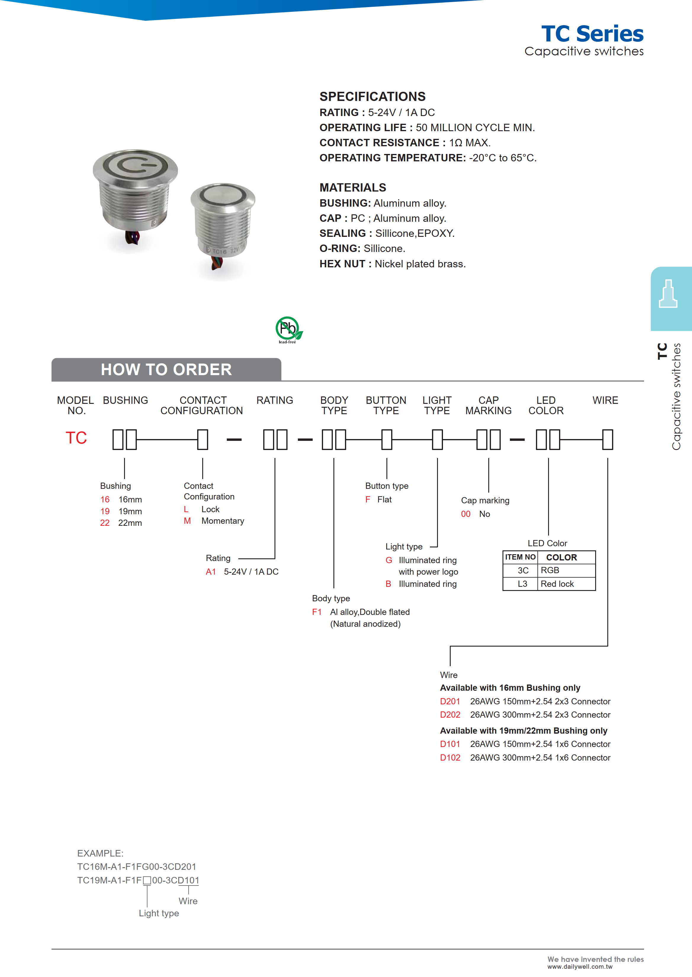 | 21 | TC19M-A1-F1FB00-3CD101 | 1A,5-24VDC | 引出线连接器 | 瞬间型 | RGB | 19mm | -20°C ~ 65°C |