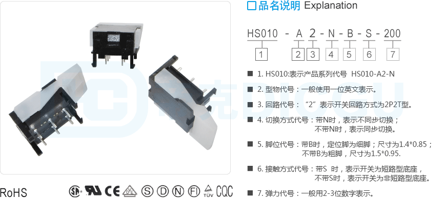 5. 脚位代号:带B时,表示开关底座的两个定位脚为细脚;细脚尺寸为1.4*0.85;不带B时,表示开关底座的两个定位脚为粗脚,粗脚尺寸为1.5*0.95.
