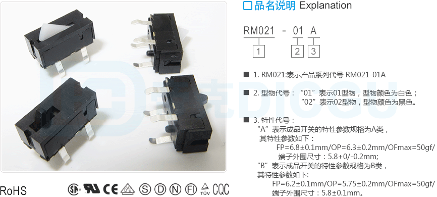 “A”表示成品开关的特性参数规格为A类,其特性参数如下:FP=6.8±0.1mm/OP=6.3±0.2mm/OFmax=50gf/端子外围尺寸:5.8+0/-0.2mm;