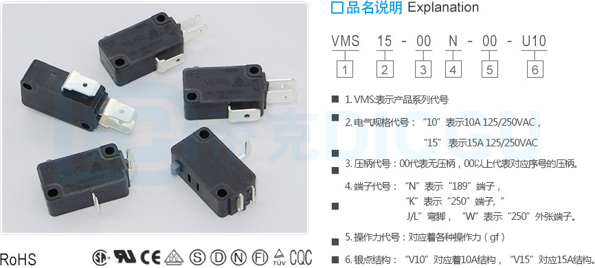 VMS10电气规格:10A 125VAC/250VAC