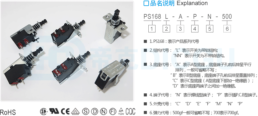 2. 结构代号:“L”表示开关为带锁结构; “NN”表示开关为不带锁结构。