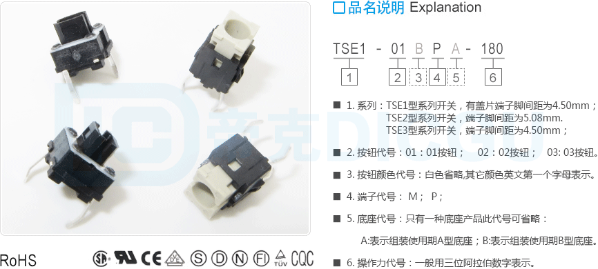 TSE1型系列开关,有盖片且端子脚间距为4.50mm;