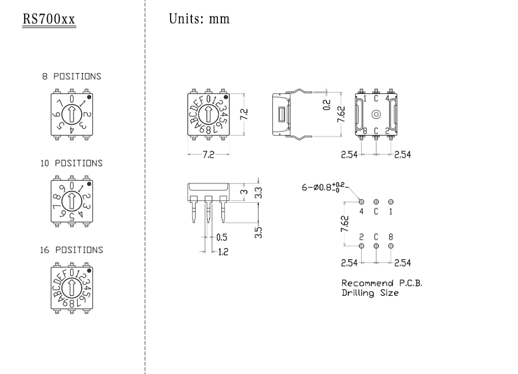 | 1 | RS70010 | 24VDC | 0.5A | 3x3 | 直插式 | 竖直 | 齐平型 | BCD 7位 | -25-70°C |