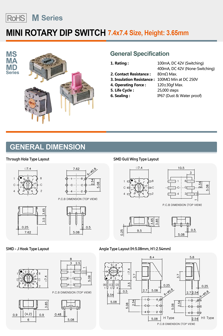 | 7 | MSDR-04J | 旋转式 | 平型 | 顶部 | 7.4*7.4mm | 实码 | 42V/100mA | 4P | 3*2 | SMT | 2.54mm | 管装 | 65pcs |
