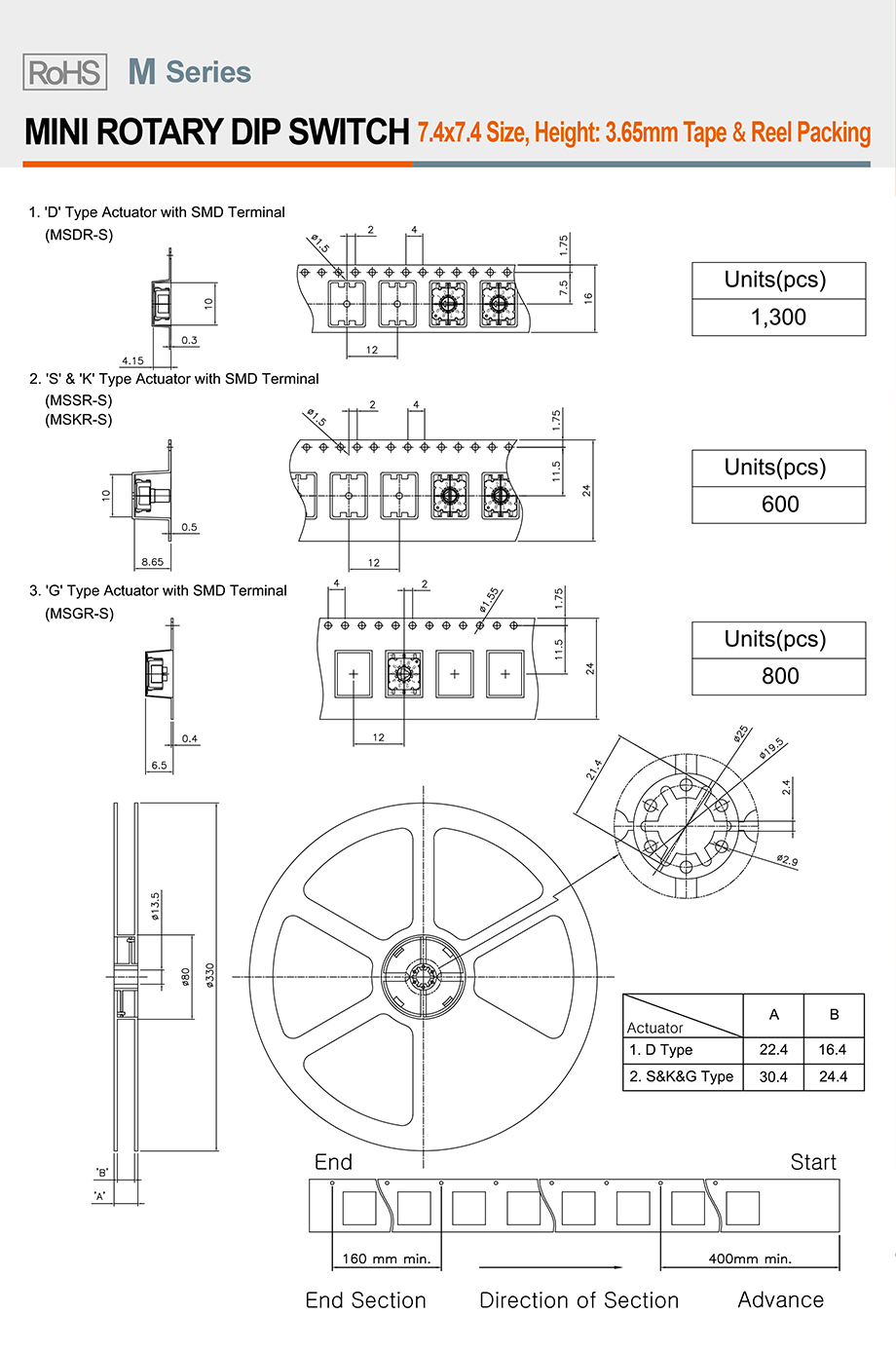 | 92 | MSSR-04JTR | 旋转式 | 轴型 | 顶部 | 7.4*7.4mm | 实码 | 42V/100mA | 4P | 3*2 | SMT | 2.54mm | 卷带 | 600pcs |