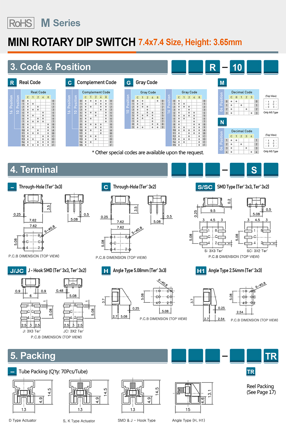| 5 | MSDR-04SC | 旋转式 | 平型 | 顶部 | 7.4*7.4mm | 实码 | 42V/100mA | 4P | 3*2 | SMT | 2.54mm | 管装 | 65pcs |