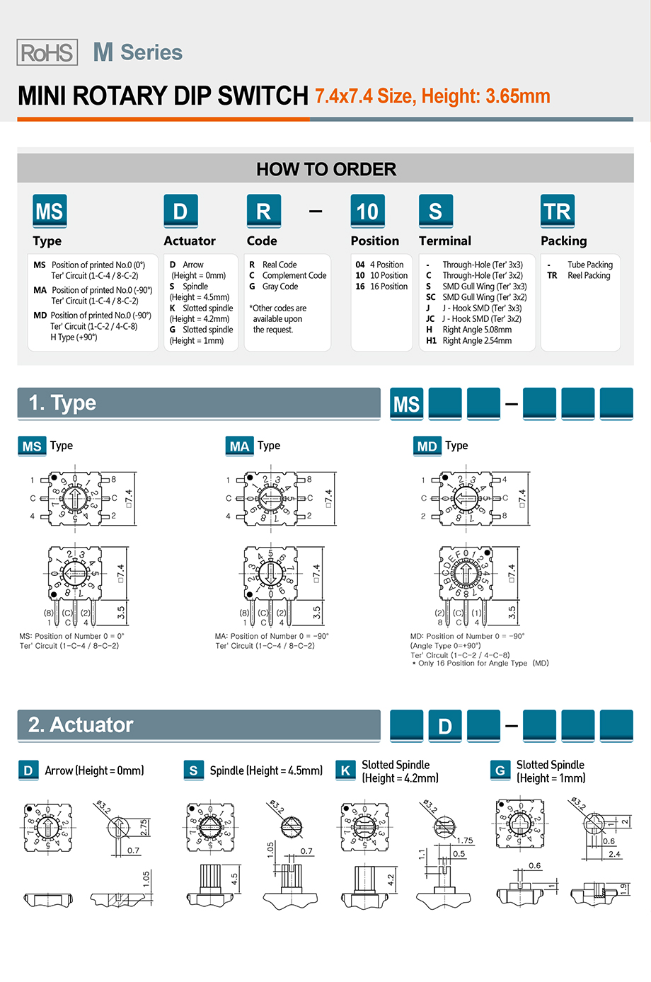 | 6 | MSDR-04SCTR | 旋转式 | 平型 | 顶部 | 7.4*7.4mm | 实码 | 42V/100mA | 4P | 3*2 | SMT | 2.54mm | 卷带 | 1300pcs |