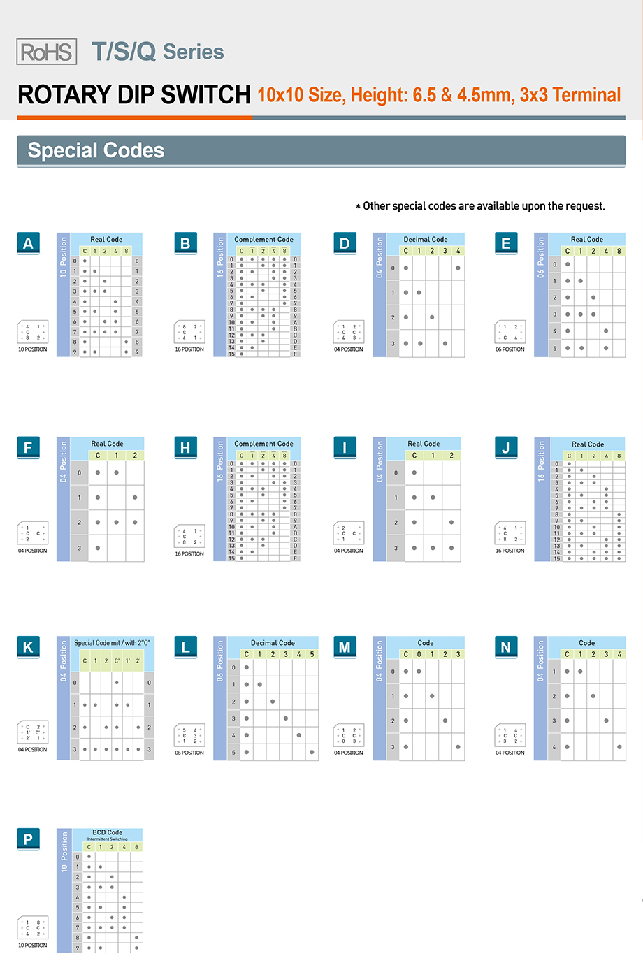 | 70 | TDC-10SCTR | 旋转式 | 平型 | 顶部 | 10*10mm | 补码 | DC42V/150mA | 10P | 3*2 | SMT | 2.54mm | 卷带 | 600pcs |
