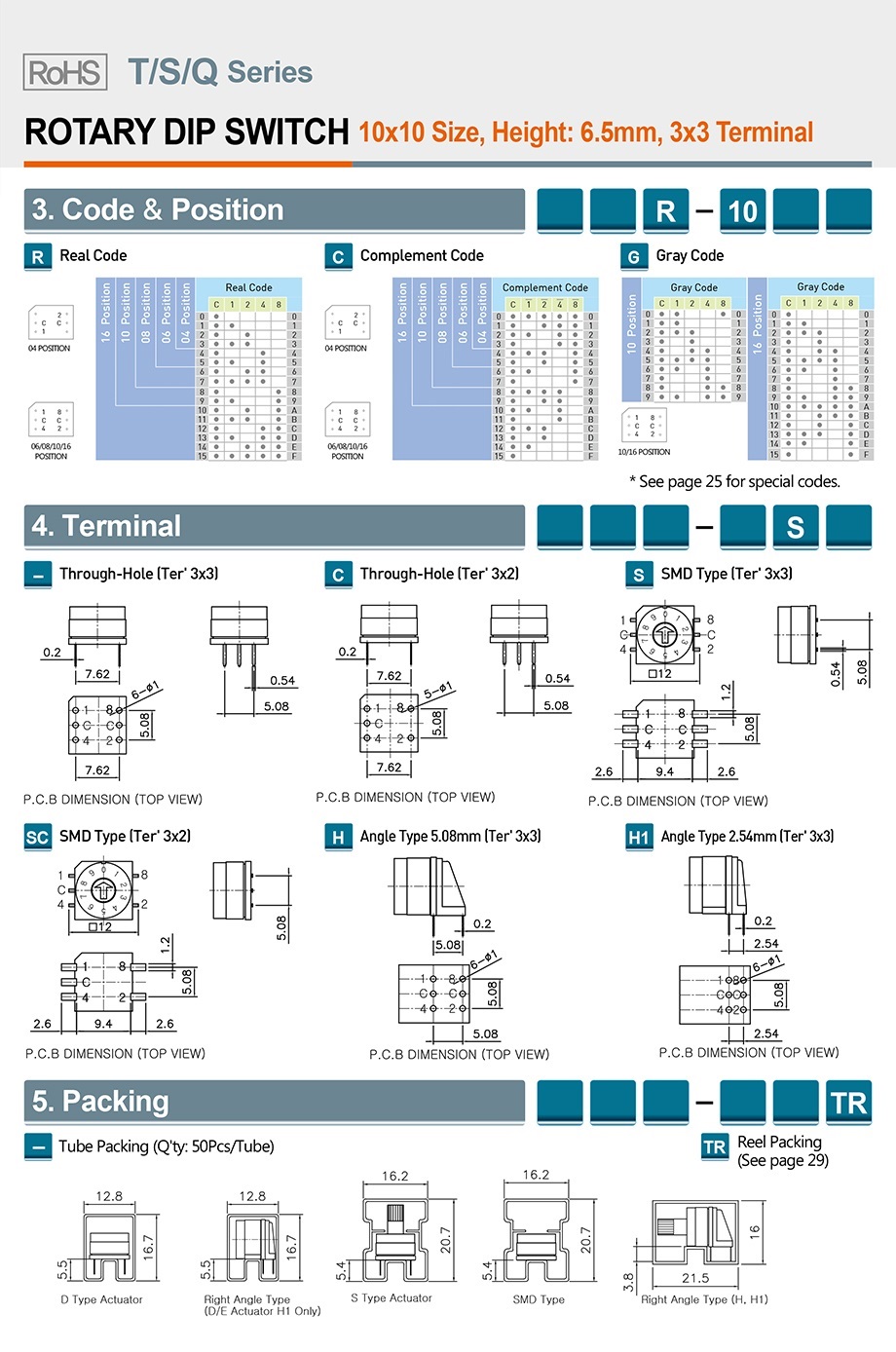 | 94 | TDG-06SCTR | 旋转式 | 平型 | 顶部 | 10*10mm | 格雷码 | DC42V/150mA | 6P | 3*2 | SMT | 2.54mm | 卷带 | 600pcs |