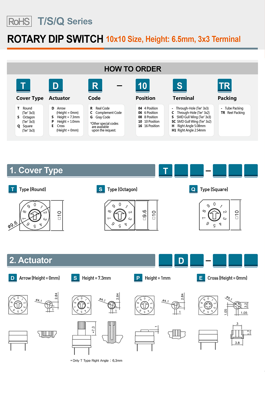 | 92 | TDG-06STR | 旋转式 | 平型 | 顶部 | 10*10mm | 格雷码 | DC42V/150mA | 6P | 3*3 | SMT | 2.54mm | 卷带 | 600pcs |