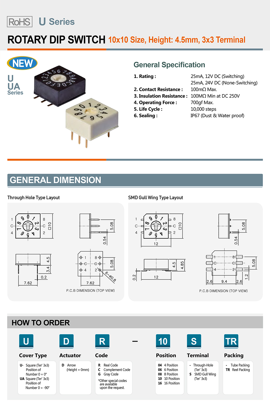 | 23 | UDC-04STR | 旋转式 | 平型 | 顶部 | 10*10mm | 补码 | 12VDC/25mA | 4P | 3*3 | SMT | 2.54mm | 卷带 | 600pcs |