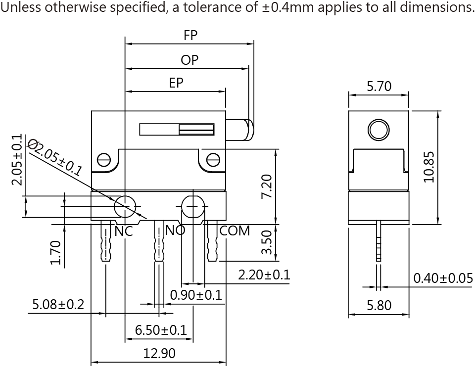 | 20 | MDU-DFW-P3G3L-B00E1E-Z | 3A,125/250VAC | SPST-NO | 柱塞 | 侧边 | 焊片 |