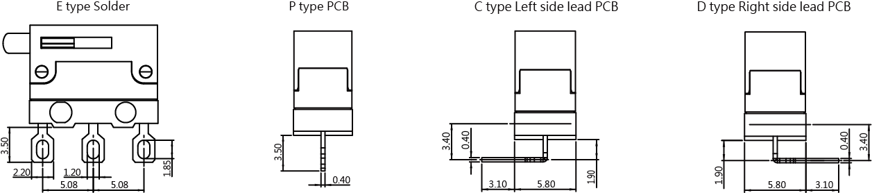 | 9 | MDU-DFW-P1G1L-B00E2E-Z | 0.1A,125/250VAC | SPST-NC | 柱塞 | 侧边 | 焊片 |