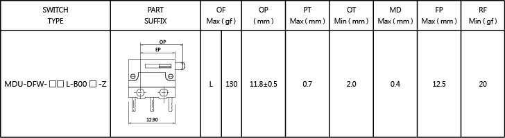 | 31 | MDU-DFW-05L-B00E0E-Z | 5A,125/250VAC | SPDT | 柱塞 | 侧边 | 焊片 |
